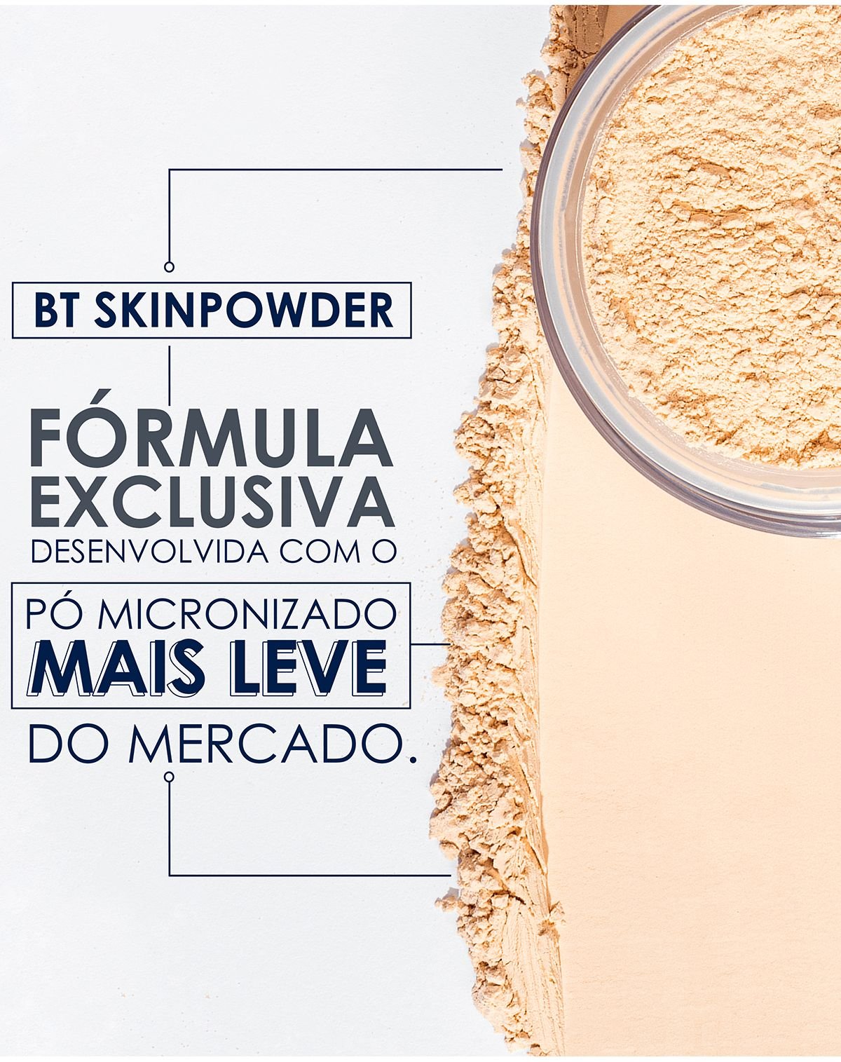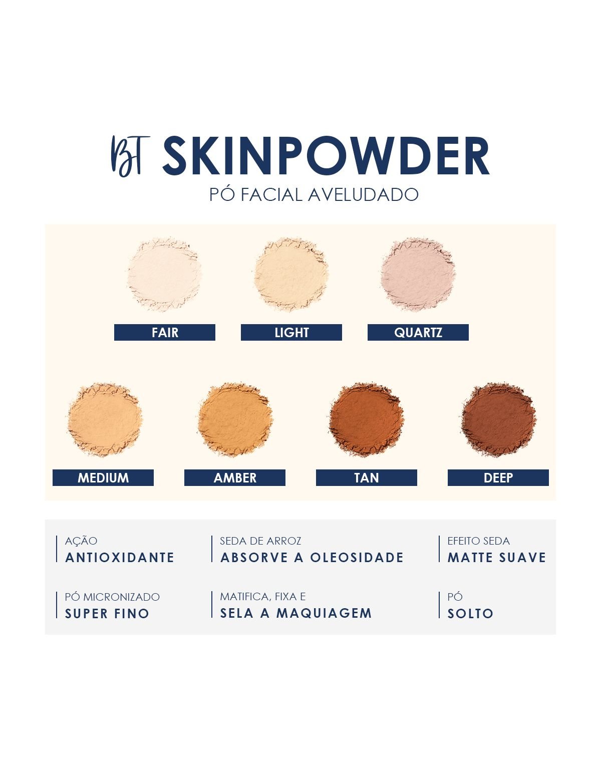 BT Skinpowder 15g – Pó solto ultrafino Matte aveludado, controla oleosidade com Rice Silk e Vitamina E. Efeito Soft Focus, resistente à água e não comedogênico. Fixa maquiagem por horas sem pesar. 7 tons versáteis.