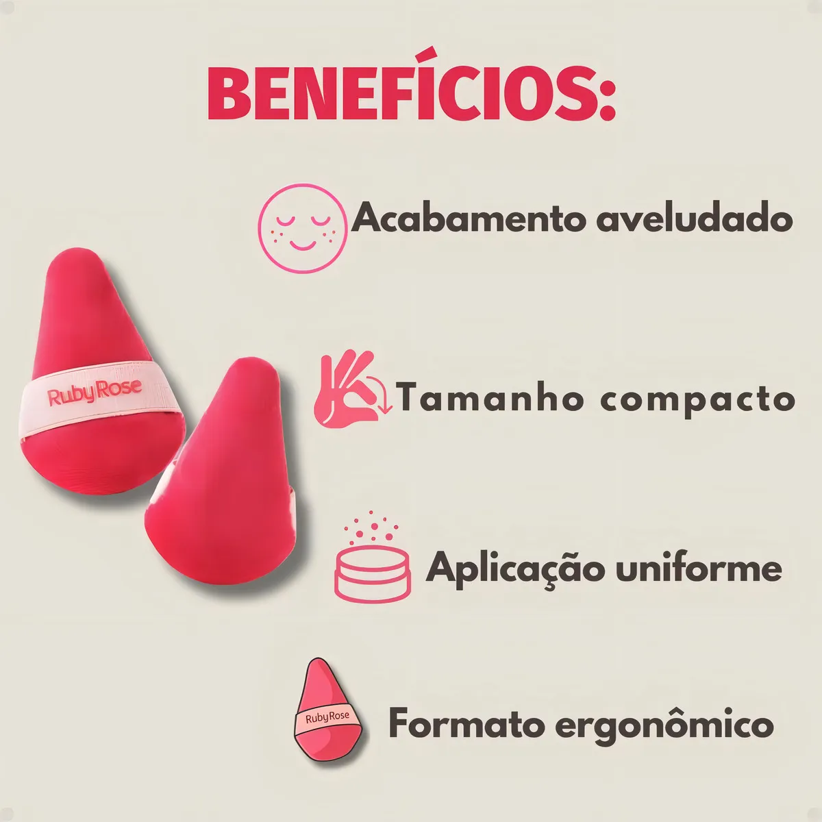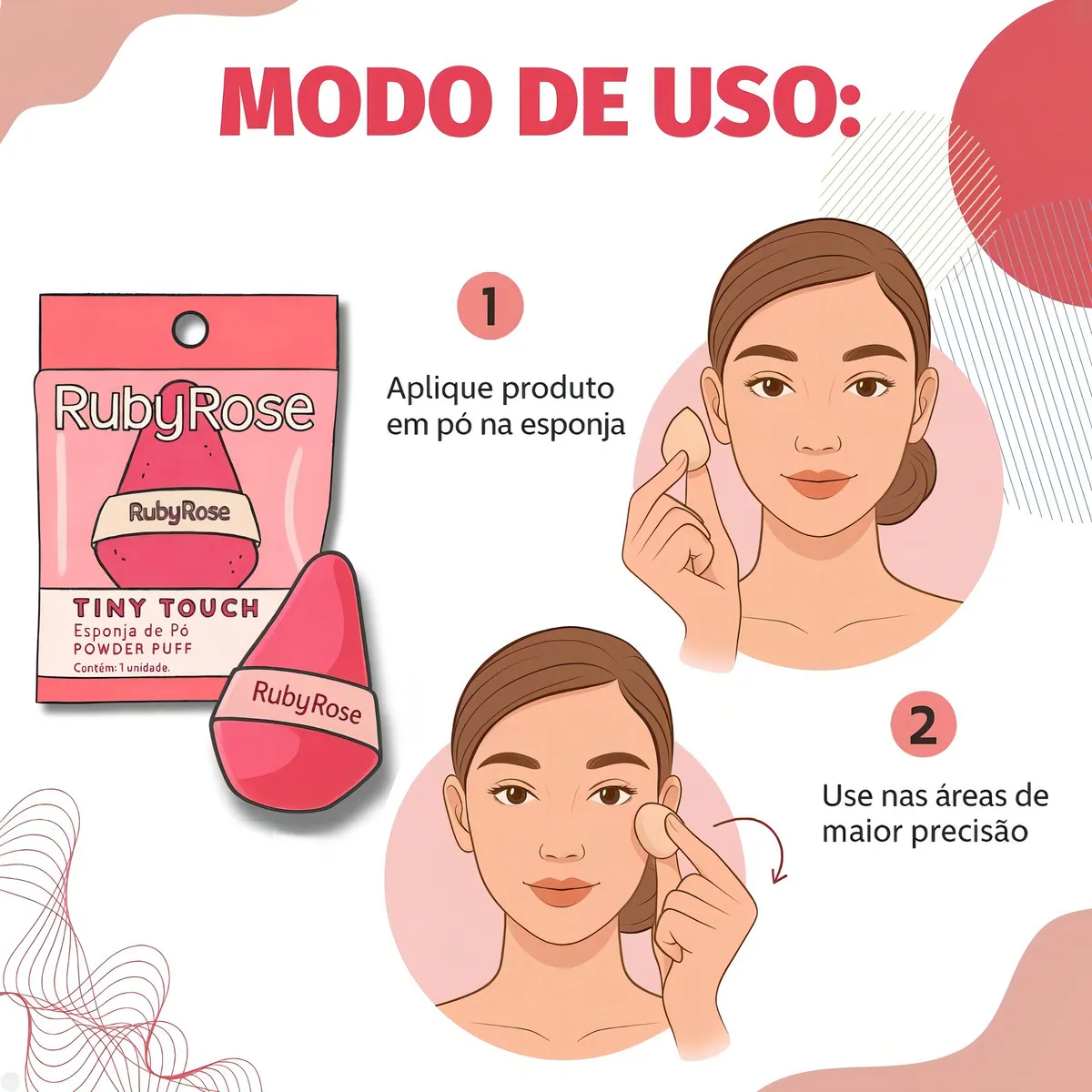 A Esponja Tiny Touch Ruby Rose é ideal para uma aplicação precisa da maquiagem, especialmente em áreas menores e delicadas do rosto, como abaixo dos olhos, cantos do nariz e região dos lábios.