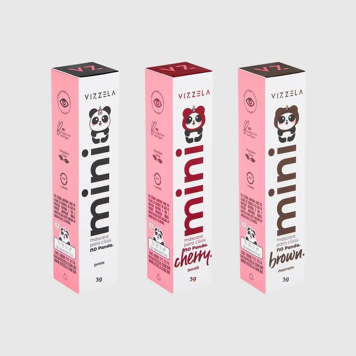 Kit com três mini máscaras No Panda Vizzela: preta, marrom e bordô. Alta definição, pigmentação intensa, tecnologia que não borra e aplicadores precisos. Praticidade e variedade para qualquer ocasião.