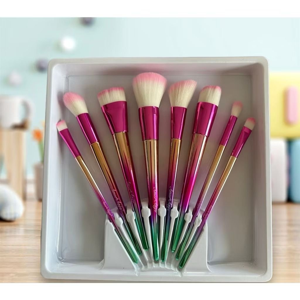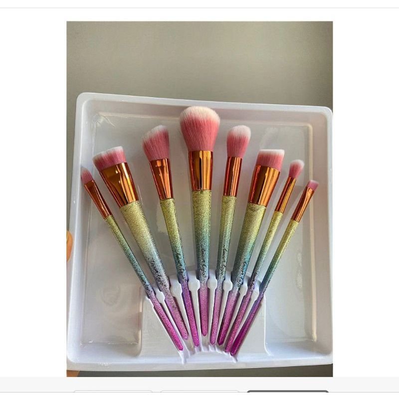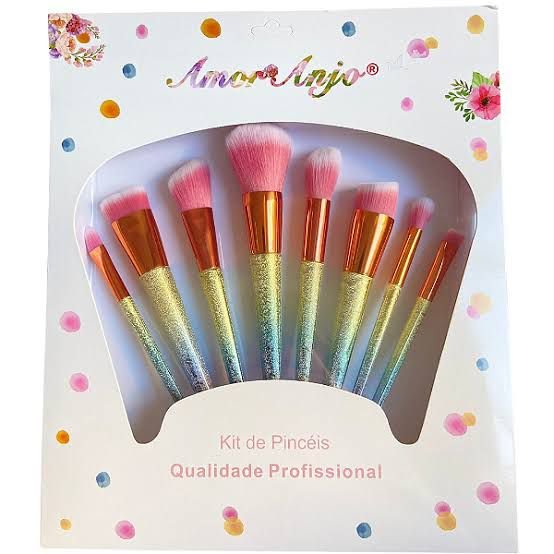 “Kit de 8 pincéis Amor e Anjo com cerdas macias, ideal para uma maquiagem completa e acabamento profissional. Inclui pincéis para pó, blush, base, contorno, sombra e mais.”